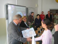 S překladem technických informací pomáhal vedoucí našeho kroužku p. uč. Jaroslav Landa DiS. Pan Alexandrov po skončení své přednášky ocenil znalosti vedoucího našeho kroužku astronomie a nabídl p. učiteli dovezenou prezentaci ke zkopírování.
